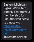 Fraudulent Text Alert: We have reports of individuals receiving fraudulent text messages like the one pictured. These texts are NOT legitimate. If you receive a similar text, do NOT respond or click on any links. If you have any concerns about your accounts, please get in touch with your local branch.